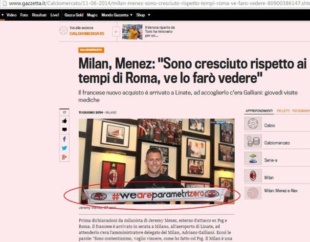 MILAN CLAMOROSA GAFFE GAZZETTA FOTO MENEZ SCIARPA – Clamorosa gaffe de La Gazzetta dello Sport, dopo lo sbarco a Milano di Jeremy Menez. Nella sua versione online ha pubblicato una foto che ritrae il nuovo giocatore del Milan nel ristorante Giannino con una sciarpa che recita “#weareparametrizero” al posto della scritta con l’hasthag ordinario “#weareacmilan”. Si trattava effettivamente di un fotomontaggio creato ad arte da qualcuno ed erroneamente ripreso dalla Gazzetta. Successivamente questa immagine è stata rimossa, ma la riportiamo di seguito: