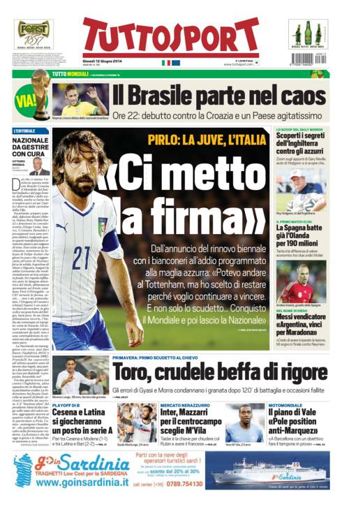 TUTTOSPORT PIRLO – Su Tuttosport si parla di Andrea Pirlo che ha dichiarato di voler lasciare la Nazionale al termine del Mondiale brasiliano.