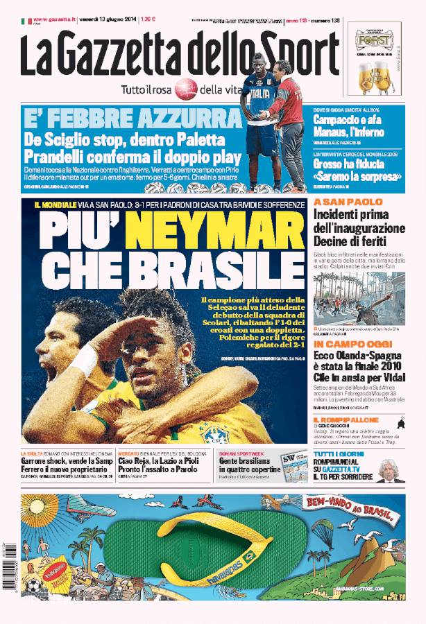 GAZZETTA NEYMAR BRASILE – La Gazzetta dello Sport parla del Brasile che vince tre a uno contro la Croazia nell’esordio Mondiale. Doppietta di Neymar.