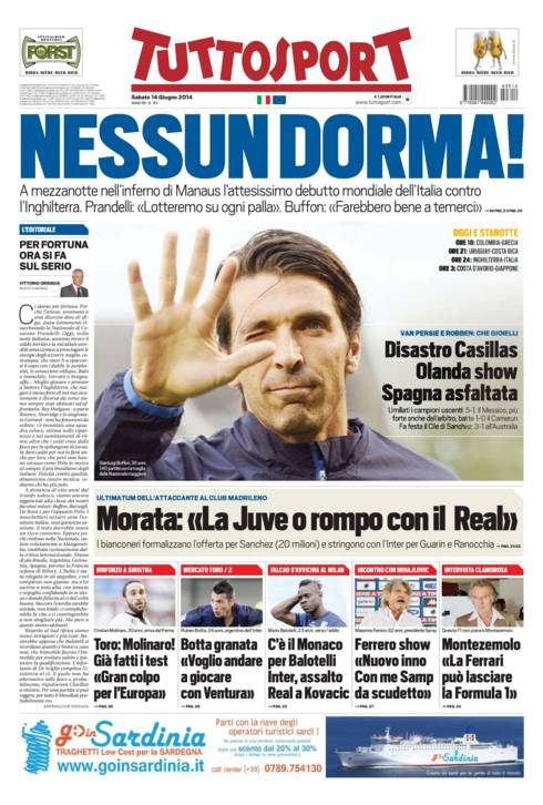 TUTTOSPORT ITALIA – Anche Tuttosport apre con il debutto dell’Italia contro l’Inghilterra nel Mondiale brasiliano. Servirà una bella Italia.