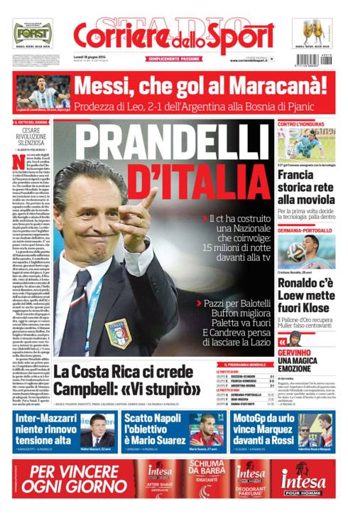 Corriere dello Sport – Prandelli d’Italia 16/06/2014 di Ruggieri CORRIERE PRANDELLI – Sul Corriere dello Sport si parla di Prandelli che ha in mente una rivoluzione in vista del match contro la Costa Rica. la redazione di Calciomercatonews.com