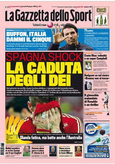 GAZZETTA SPAGNA – Anche la Gazzetta dello Sport parla dell’eliminazione precoce della Spagna che ha perso contro il Cile per due a zero.