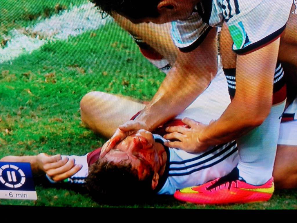 FOTO GERMANIA MULLER – Episodio shock per Thomas Muller al termine di Germania-Ghana. Proprio nell’ultima occasione di gioco, il bomber tedesco, nel tentativo di colpire di testa, ha accidentalmente colpito con la testa la spalla di un difensore ghanese, crollando al suolo ed in una pozza di sangue. Serviranno certamente alcuni punti di sutura per il 13 della Germania che, possibilmente, dovrà riposare per qualche giorno.