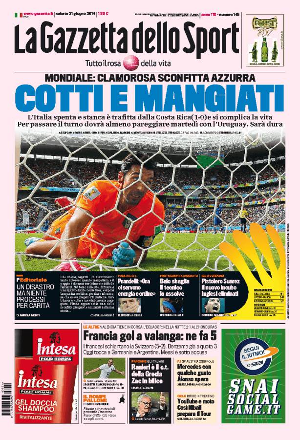 GAZZETTA ITALIA – La Gazzetta dello Sport parla della clamorosa sconfitta dell’Italia contro il Costa Rica per uno a zero. Servirà almeno un pareggio con l’Uruguay.