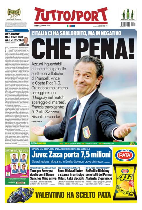 TUTTOSPORT ITALIA – Eloquente il titolo di Tuttosport in prima pagina che parla di prestazione penosa dell’Italia contro il Costa Rica.