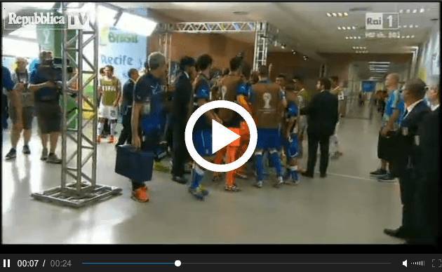 VIDEO MONDIALI BRASILE 2014 – La Costa Rica batte incredibilmente l’Italia 1-0 e si qualifica agli ottavi di finale del Mondiale brasiliano. Nessuno avrebbe scommesso un euro sui Ticos che hanno invece sovvertito qualsiasi pronostico sconfiggendo nell’ordine Uruguay e Azzurri. Ieri però, nonostante in campo non si siano registrati attimi di tensione, lo stesso non può dirsi al momento del rientro negli spogliatoi dopo il primo tempo. Come si vede nel video (immagini Rai tratte da Repubblica Tv), alcuni italiani, tra cui Sirigu, rispondono alle provocazioni dei costaricani ancora imbestialiti per il rigore non concesso per il fallo di Chiellini su Cambpell. Servirà l’intervento di Prandelli e dello staff italiano per placare gli animi evidentemente surriscaldati.
