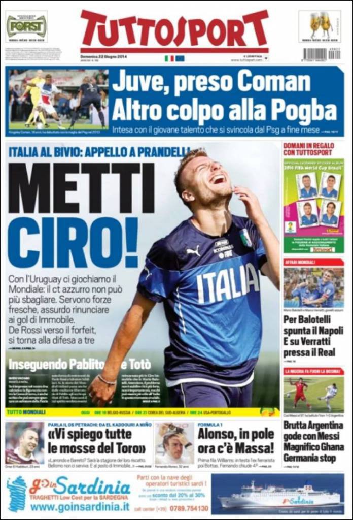 RASSEGNA STAMPA TUTTOSPORT – Appello a Prandelli: con l’Uruguay ci giochiamo il Mondiale, il C.T. azzurro non può sbagliare. Servono forze fresche, assurdo rinunciare ai gol di Immobile. De Rossi verso il forfait, si torna alla difesa a tre. Brutta Argentina, gode Messi. Magnifico Ghana, Germania stop.
