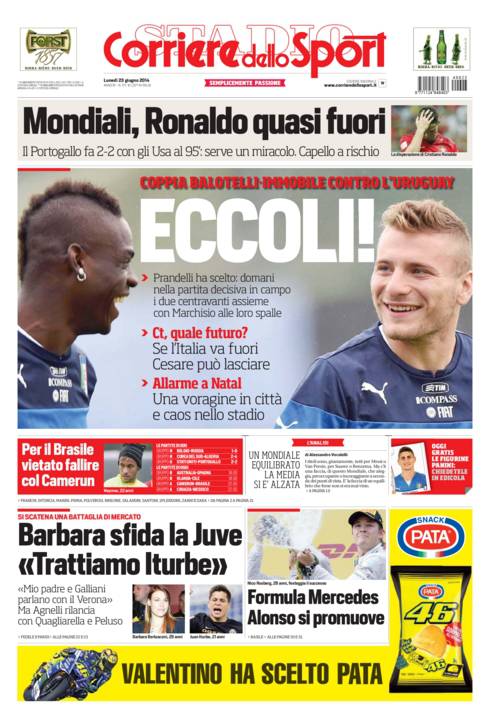 CORRIERE ITALIA – Il duo d’attacco Balotelli-Immobile è pronto a fare bene in vista della prossima partita dell’Italia contro l’Uruguay. Questa la prima pagina del Corriere dello Sport.