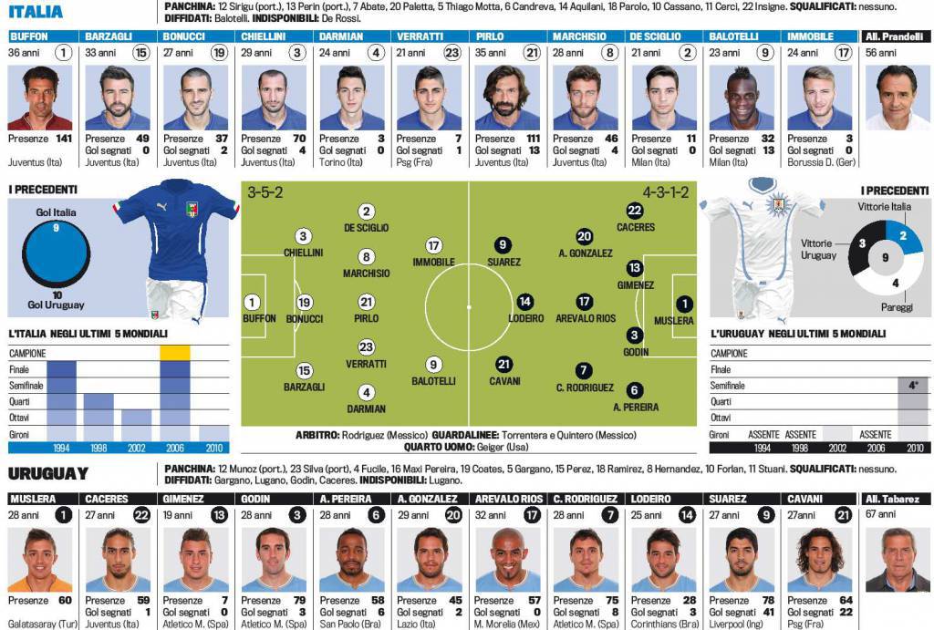 FOTO ITALIA URUGUAY PRANDELLI SUAREZ – Quest’oggi alle ore 18 in Italia, le 13 in Brasile, l’Italia di Cesare Prandelli si gioca tutto al Mondiale brasiliano. Basta un pareggio per passare agli ottavi di finale, con una sconfitta passano gli uruguagi. Prandelli si affida al modulo Juventus e la difesa sarà tutta bianconera, da Chiellini a Bonucci con Barzagli che completerà il pacchetto arretrato. A centrocampo spazio a Pirlo, Verratti, Marchisio, con De Sciglio a Darmian sulle fasce laterali. In attacco la coppia gol Balotelli e Immobile. Nell’Uruguay il maestro Tabarez cercherà di farci paura con Suarez e Cavani come coppia d’attacco. Le probabili formazioni secondo la Gazzetta dello Sport.