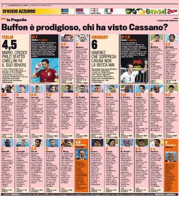 FOTO ITALIA URUGUAY GAZZETTA BALOTELLI SUAREZ – L’amarezza della Gazzetta dello Sport rispecchia quella di un’intera Nazionale che per il secondo Mondiale consecutivo esce fuori ai gironi. L’Italia perde uno a zero contro l’Uruguay ed esce fuori dai Mondiali anticipatamente. La Gazzetta intravede in Balotelli il peggiore in campo, quattro in pagella per il milanista che non riesce a tenere un pallone. Delusione anche da parte di Immobile e Cassano, con Prandelli che sbaglia tutto. Nell’Uruguay il migliore è Godin, il capitano, bravo anche il giovane Gimenez. Suarez si becca un tre per l’ennesimo morso, questa volta a Chiellini. Voti e pagelle della Gazzetta dello Sport.