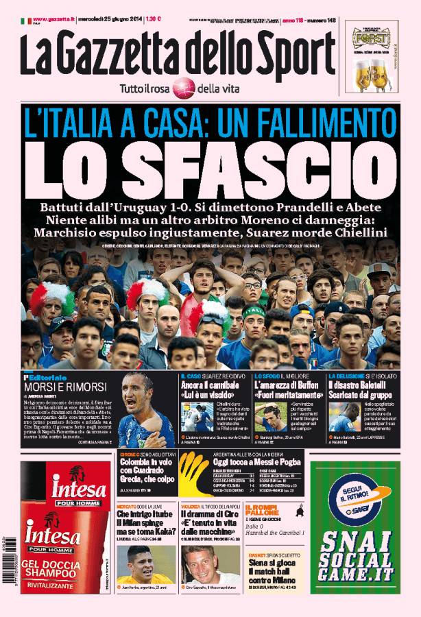 GAZZETTA ITALIA – La Gazzetta dello Sport parla dell’eliminazione dell’Italia dai Mondiali dopo l’uno a zero contro l’Uruguay.