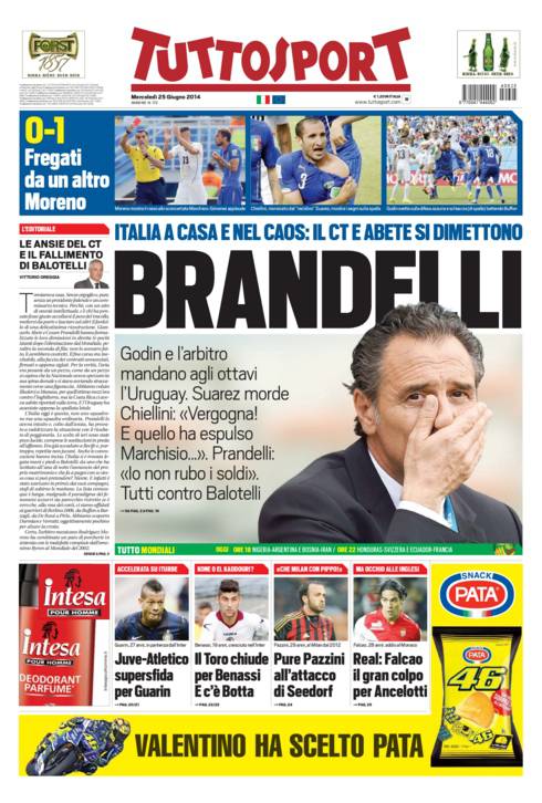 TUTTOSPORT ITALIA – Eloquente il titolo di Tuttosport. L’Italia esce fuori dai Mondiali e si dimettono Abete e Prandelli.