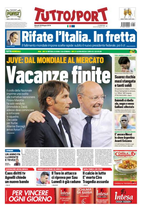 TUTTOSPORT JUVENTUS – La Juventus dovrà iniziare le operazioni di calciomercato. Lo afferma Tuttosport in prima pagina, Conte e Marotta in azione.