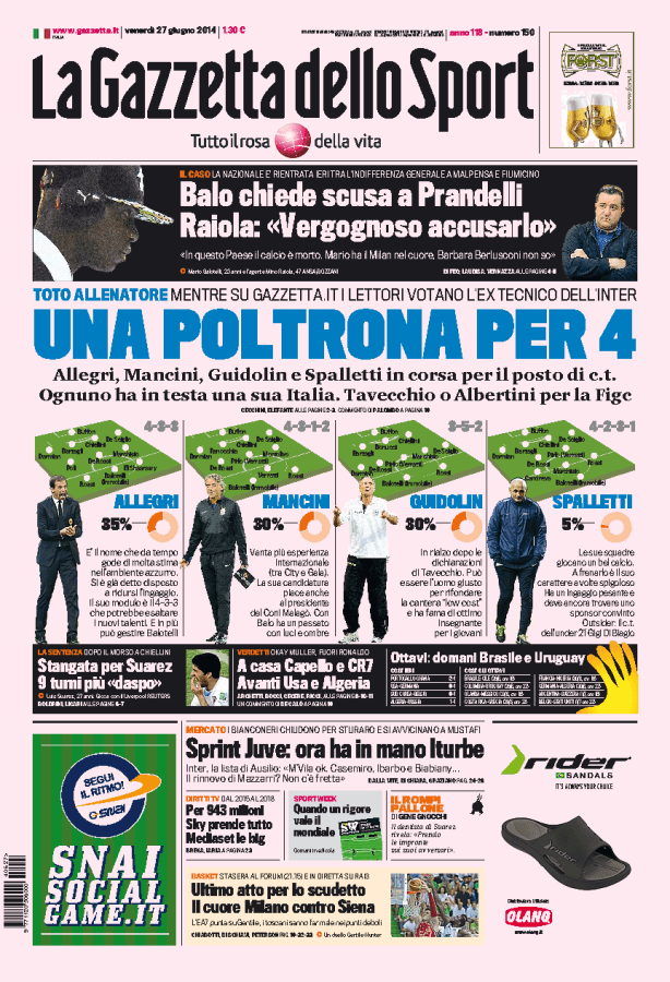 GAZZETTA ITALIA – La Gazzetta dello Sport parla del prossimo c.t., in lizza ci sono quattro tecnici, Allegri, Mancini, Spalletti e Guidolin.