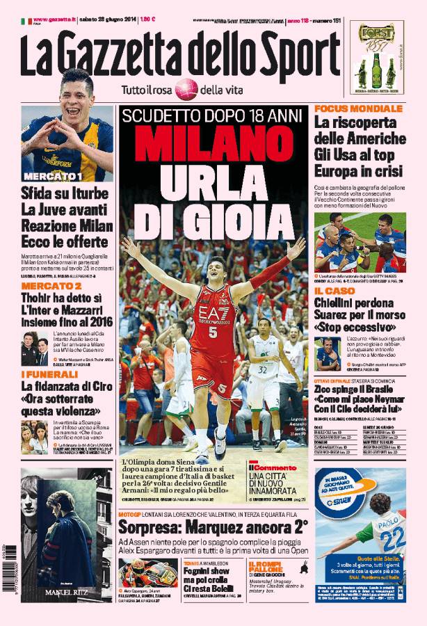GAZZETTA MILANO – La Gazzetta dello Sport parla della vittoria dell’Armani Milano in campionato dopo 18 anni dall’ultimo campionato vinto.