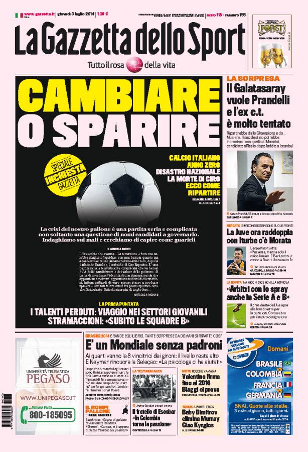 GAZZETTA CALCIO – La Gazzetta dello Sport racconta l’inchiesta sul calcio italiano che deve assolutamente cambiare per ritornare ai vecchi livelli.