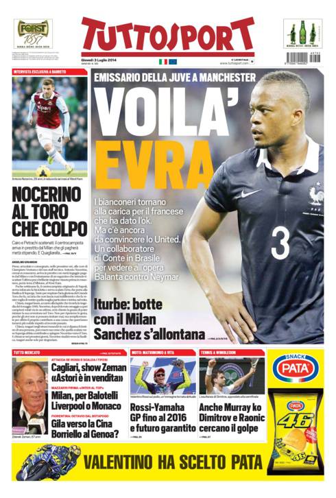 TUTTOSPORT EVRA – Su Tuttosport si parla di Evra che piace alla Juventus e in particolare ad Antonio Conte.