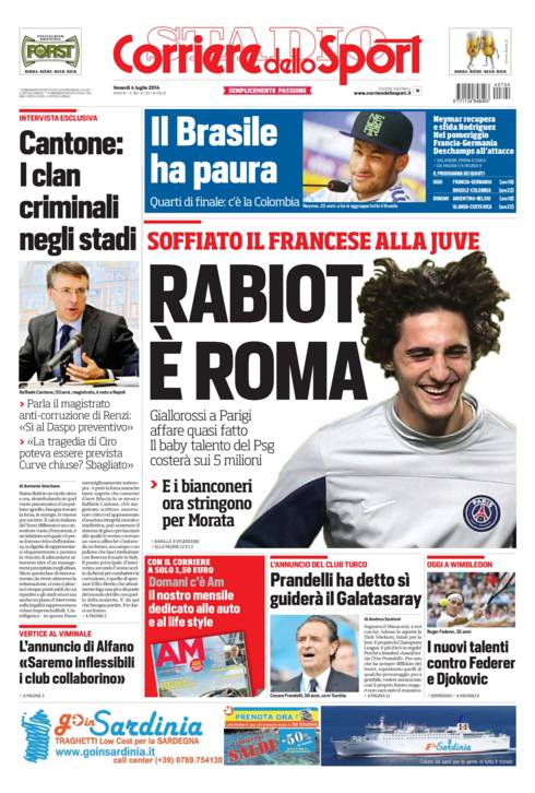 CORRIERE ROMA – La Roma sembra aver soffiato il centrocampista francese del Psg Rabiot alla Juventus. Sarebbe un colpaccio di Sabatini.