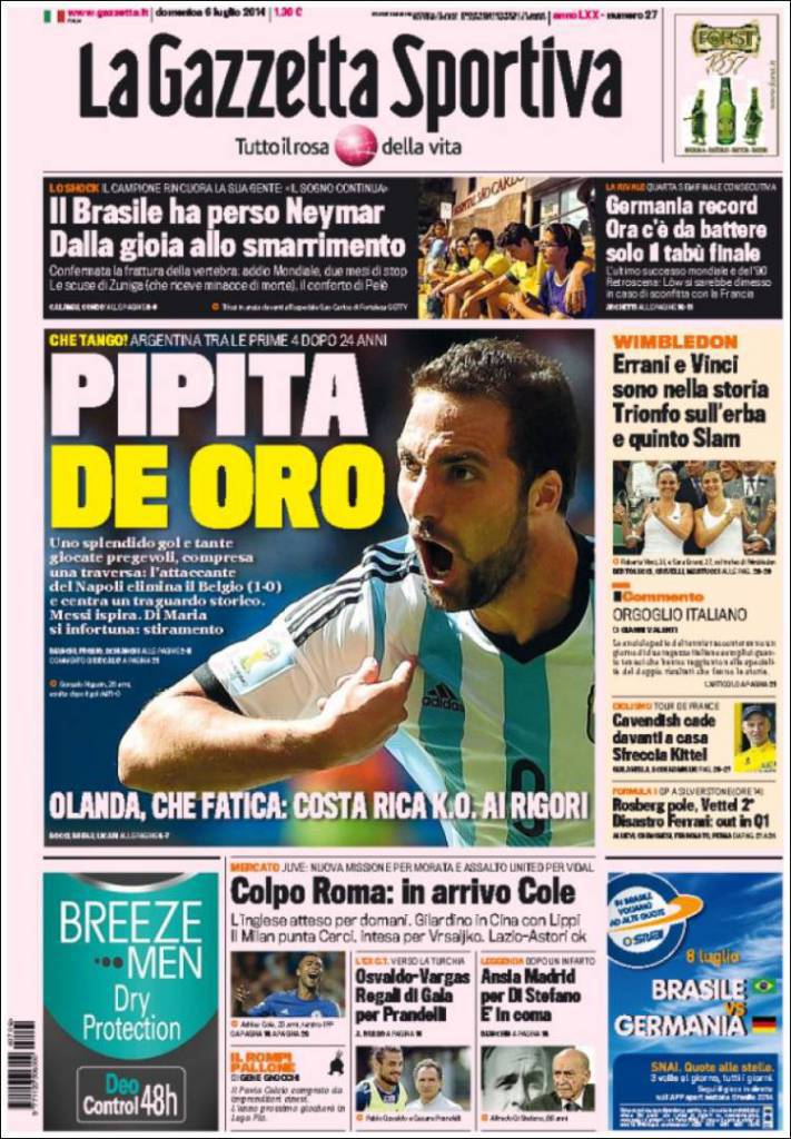 RASSEGNA STAMPA GAZZETTA DELLO SPORT – Uno splendido gol e tante giocate pregevoli, compresa una traversa: l’attaccante del Napoli elimina il Belgio e centra un traguardo storico. Messi ispira, Di Maria s’infortuna: stiramento. Olanda, che fatica: Costa Rica ko ai rigori. Colpo Roma: in arrivo Cole. Il Brasile ha perso Neymar; dalla gioia allo smarrimento.