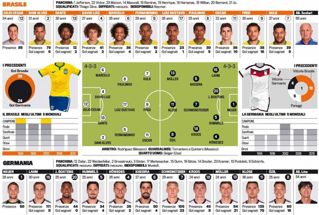 FOTO BRASILE GERMANIA SCOLARI LOEWS KLOSE – E’ il giorno della prima semifinale del Mondiale brasiliano tra il Brasile di Felipao Scolari e la Germania di Joachim Low. Due squadre importanti, due Nazionali completamente differenti che però giocheranno con lo stesso modulo. Scolari ha deciso di puntare al 4-3-3 con l’inserimento di un centrocampista in più ovvero il rientrante Luiz Gustavo. In attacco punta centrale Fred con Hulk e Oscar sulle fasce. In difesa Dante prenderà il posto di Thiago Silva squalificato. Nella Germania conferma per Klose centravanti con Muller e Ozil ai lati. Ecco le probabili formazioni secondo la Gazzetta dello Sport.