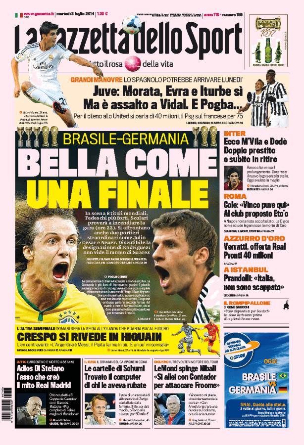 GAZZETTA BRASILE GERMANIA – Questa sera grande semifinale tra Brasile e Germania. Sembra una finale secondo la Gazzetta.