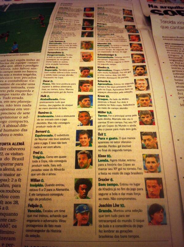 MONDIALI 2014 BRASILE GERMANIA – La batosta rimediata ieri dal Brasile è già storia, mai una sconfitta simile per la nazionale verdeoro ai mondiali e un paese intero è deluso. C’è grande amarezza nel day after, i giornali brasiliani ci vanno giù pesanti. O Globo, uno dei quotidiani di punta, non perde tempo neppure nell’assegnare voti ai giocatori della seleçao: tutti zero. Non si salva nessuno, come potete vedere dalla foto che vi mostriamo. Alti invece i voti dei tedeschi.