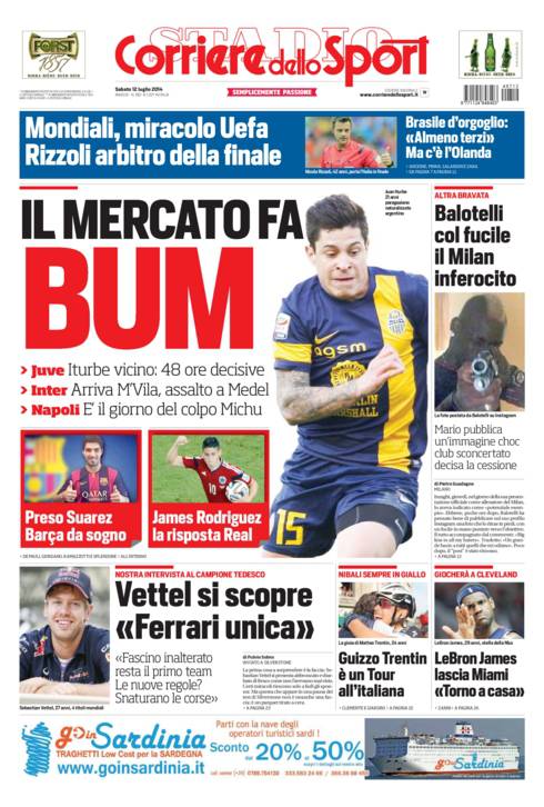 CORRIERE MERCATO – Sul Corriere dello Sport si parla del mercato con Iturbe verso la Juventus, M’Vila e Medel verso l’Inter.