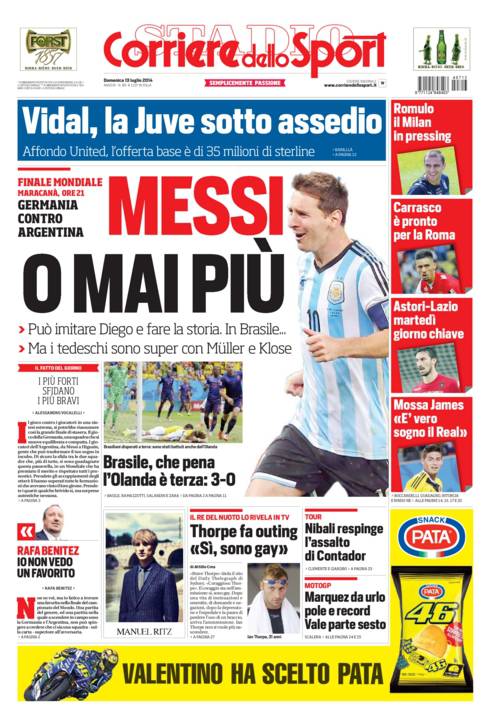 RASSEGNA STAMPA CORRIERE DELLO SPORT – Per Lionel Messi, stasera contro la Germania, c’è l’occasione della vita. Può imitare Maradona ed entrare nella storia ma i tedeschi sono super con Muller e Klose. Brasile, che pena: l’Olanda è terza vincendo 3-0. Vidal, la Juve sott’assedio. Romulo, il Milan in pressing. Carrasco è pronto per la Roma. Astoria-Lazio, martedì giorno chiave. Mossa James: “E’ vero, sogno il Real”.