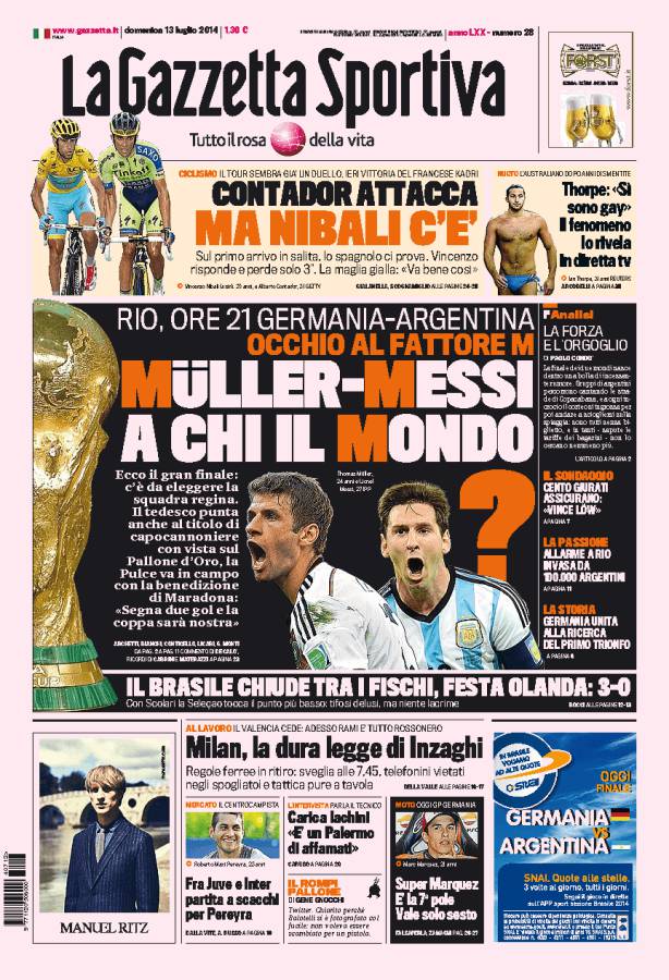 RASSEGNA STAMPA GAZZETTA DELLO SPORT – Ora 21 a Rio, attendi al fattore M: c’è da eleggere la nuova regina del Mondiale. Da una parte c’è il tedesco che punta al titolo di capocannoniere con vista sul Pallone d’Oro e dall’altra c’è la Pulce che va in campo con la benedizione di Maradona: “Segna due gol e la coppa sarà nostra”.