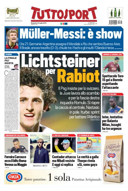 RASSEGNA STAMPA GAZZETTA DELLO SPORT – Il Psg vuole lo svizzero, la Juve lavora allo scambio e per la fascia inquadra Romulo. Si riapre la caccia al centrale, Nastasic in pole. Iturbe: sprint per battere l’Atletico. Muller-Messi, è show. Ore 21: Germania-Argentina assegna il Mondiale a Rio che sembra Buenos Aires. Il Brasile, ancora travolto (0-3) chiude tra i fischi.