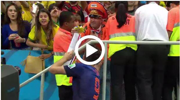VIDEO OLANDA VAN PERSIE – Applausi a scena aperta per Robin Van Persie, numero 9 della nazionale olandese che, anche ieri sera, è andato a segno nella finale per il terzo ed il quarto posto contro il Brasile. Una gran bella prestazione, coronata con un gesto davvero commovente: al termine della premazione, Van Persie è andato a cercare il super tifoso olandese chiamato “the Oranje Generaal”, uomo che dal 1994 segue ogni partita della nazionale dei tulipani con indosso sempre la stessa divisa da pilota totalmente arancio, per regalargli la sua fascia da capitano e soprattutto la medaglia di bronzo del mondiale. Ecco il video dell’episodio: