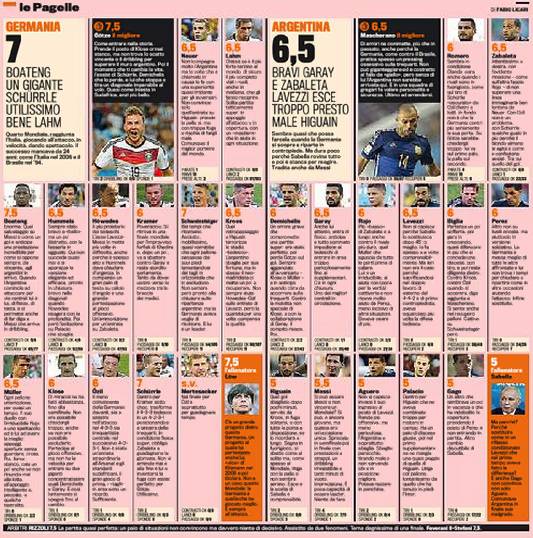 FOTO GERMANIA ARGENTINA VOTI PAGELLE BOATENG MESSI – La vittoria del Mondiale della Germania ha diversi protagonisti. Quello di ieri è stato Mario Gotze, attaccante del Bayern Monaco che è entrato nella ripresa al posto di Klose. Il giovane tedesco stoppa un passaggio di Schurrle e batte Romero per l’uno a zero definitivo. Ma la Germania ringrazia anche Boateng, fratello di Kevin-Prince, autentico baluardo della difesa. Ottima anche la prova di Schweinsteiger. Nell’Argentina bravo Mascherano, un leader. Proprio quello che manca a Messi, qualche dribbling riuscito ma tante pause. Ha deluso, così come Higuain. Voti e pagelle della Gazzetta dello Sport.