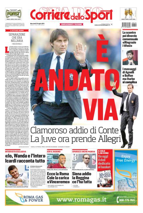 CORRIERE CONTE – Antonio Conte ha lasciato la Juventus, separazione consensuale. Allegri favorito per la panchina bianconera.