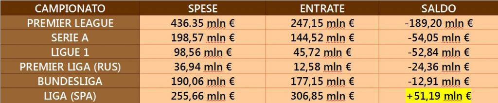 Dopo soli 20 giorni di ufficialità dall’apertura del calciomercato, è già tempo di iniziare con i primi bilanci per quanto riguarda le somme spese sul mercato dalle società italiane, ed allargando lo sguardo anche al nostro continente, quello delle squadre europee. Sfruttando i dati messi a disposizione dal noto portale Transfermarkt.it, la redazione di CalciomercatoNews.com ha stilato una classifica riguardante le somme spese, gli incassi ed il saldo totale di questo inizio di calciomercato 2014-2015. Domina sulle spese, e c’era da aspettarselo, la Premier League, che però a causa delle entrate, sì altissime ma non all’altezza delle uscite, vanta un rosso da quasi 190 milioni di euro. Benissimo la Liga che è la seconda per spese effettuate, ma la prima in assoluto per entrate, potendo vantare l’unico + nel computo finale dei top campionati europei. Arranca la nostra Serie A: quasi 200 i milioni spesi, sin qui, 144 quelli incassati. Stride il paragone con la Bundes: al momento le spese sono equivalenti, ma è innegabile che il nostro campionato rispetto al tedesco sia molti passi indietro. Siamo però ancora agli inizi: con l’evoluzione del mercato, questa classifica potrebbe però rivoluzionarsi incredibilmente…
