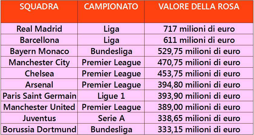 Dopo le rivoluzioni delle squadre in questo inizio di calciomercato, è interessante andare ad analizzare come il valore delle rose delle maggiori squadre europee sia variato nel corso del tempo. Avevamo lasciato, al termine della scorsa stagione, il Real Madrid in testa grazie soprattutto alla vittoria della Champions League. Dopo pochi mesi, sfruttando le valutazioni del noto portale Transfermarkt.it, possiamo notare come, grazie agli arrivi di James Rodriguez e Toni Kroos, il Real abbia consolidato notevolmente la sua prima posizione con un valore di squadra da 717 milioni di euro. Domina la Premier League con ben 4 squadre, arranca la nostra Serie A: tra le big soltanto la Juventus con un valore di rosa complessivo di 338,65 milioni.