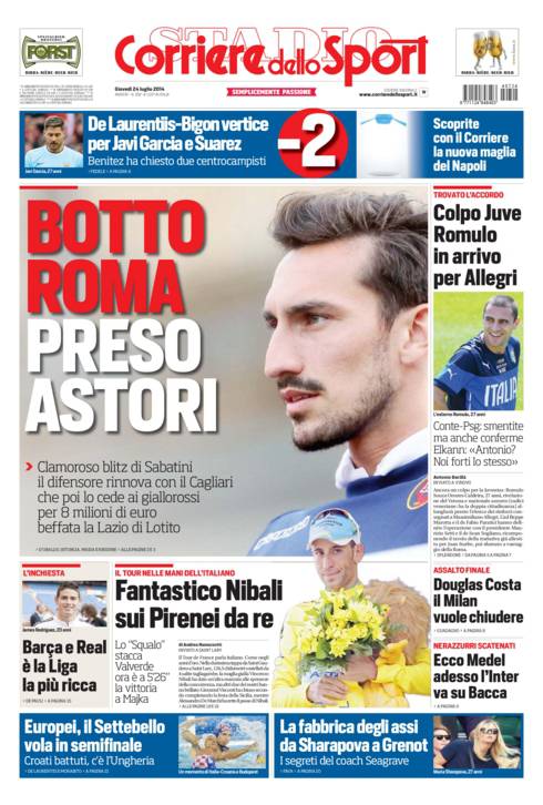 CORRIERE ROMA ASTORI – Blitz di Sabatini che strappa alla Lazio il difensore del Cagliari Astori per otto milioni di euro.