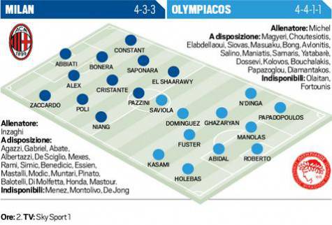 FOTO MILAN-OLYMPIACOS – Il Milan questa notte affronterà in amichevole i greci dell’Olympiacos nella torunèe americana. Dopo le sfide con Renate e Monza ecco la prima avversaria di caratura internazionale per i rossoneri. Secondo quanto riportato da Tuttosport ecco la possibile formazione del Diavolo. Inzaghi opterà per il 4-3-3 con Abbiati tra i pali, Zaccardo, Alex, Bonera e Constant in difesa; Poli, Cristante, Saponara a centrocampo quindi Niang, El Shaarawy e Pazzini a completare il tridente offensivo.