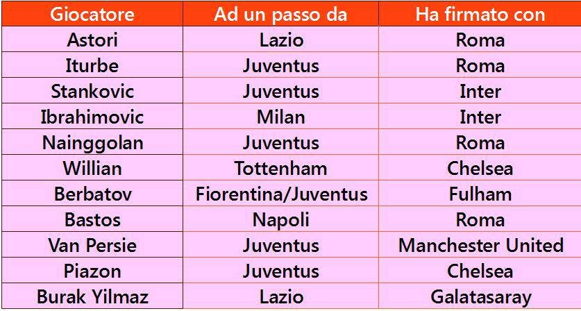 Questa forse è la beffa delle beffe. Il trequartista brasiliano Willian, prossimo a salutare l’Anzhi, decide che la nuova città in cui vivere sarà Londra: il Tottenham è ad un passo dall’ufficializzare l’affare. Willian, presente nel centro allenamenti del Tottenham, viene però chiamato dal suo agente: c’è il Chelsea su di lui. La fuga è repentina, l’affare è fatto: niente Tottenham, Willian è del Chelsea…