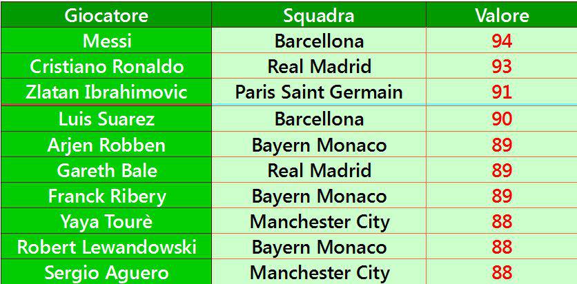 Ci avviciniamo sempre più all’inizio della stagione 2014-2015 ed, ovviamente, anche al prossimo 26 settembre, data di uscita di FIFA 15, noto videogioco prodotto dalla casa di produzioni statunitensi EASports. C’è grande attesa per quello che sarà il titolo che dovrà necessariamente fare il salto di qualità sulle console di nuova generazione. Gli appassionati seguono con attenzione quelli che sono gli sviluppi anche riguardanti l’elaborazionedel nuovo videogioco, grazie agli aggiornamenti costanti arrivati dai dirigenti EA, ma anche e soprattutto riguardanti i valori dei calciatori che scenderanno sui campi di FIFA. Nelle scorse ore è saltata sulla rete una lista ufficiosa di quelli che dovrebbero essere i valori dei più forti giocatori su FIFA 15. Non c’è ancora l’ufficialità dalla EA Sports ma non ci dovremmo spostare molto da questa lista. Sarà Leo Messi in assoluto il miglior calciatore del titolo con un overall di 94, seguito da Cristiano Ronaldo e Zlatan Ibrahimovic. Nessun italiano in lista e nessun giocatore proveniente dalla nostra Serie A.