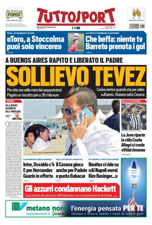 TUTTOSPORT TEVEZ – Paura per Tevez che ieri ha dovuto sborsare 36 mila euro di riscatto per liberare il padre sequestrato in Argentina.