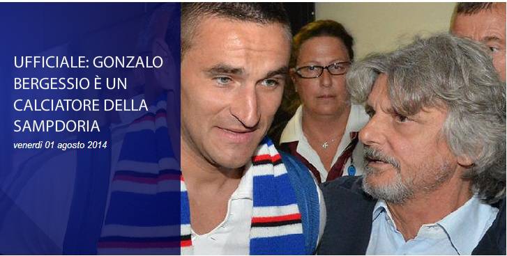 CALCIOMERCATO SAMPDORIA UFFICIALE BERGESSIO – “L’U.C. Sampdoria S.p.a. comunica di aver acquisito a titolo definitivo dal Calcio Catania i diritti sportivi del calciatore Gonzalo Rubén Bergessio (nato a Córdoba, Argentina, il 20 luglio 1984). L’attaccante, che ha già sostenuto le visite mediche e ha scelto la maglia numero 18, è già a disposizione di Sinisa Mihajlovic per l’allenamento mattutino al “Gloriano Mugnaini” di Bogliasco“. Con questo comunicato stampa la Sampdoria ufficializza l’arrivo di Gonzalo Bergessio, ex attaccante del Catania, voluto fortemente dal tecnico Mihajlovic e ufficializzato già qualche giorno fa dal presidente Ferrero.