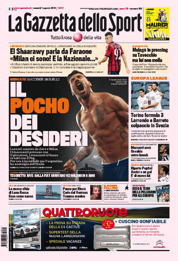 GAZZETTA LAVEZZI – La Gazzetta dello Sport parla di Lavezzi che piace sia alla Juventus che al Milan.