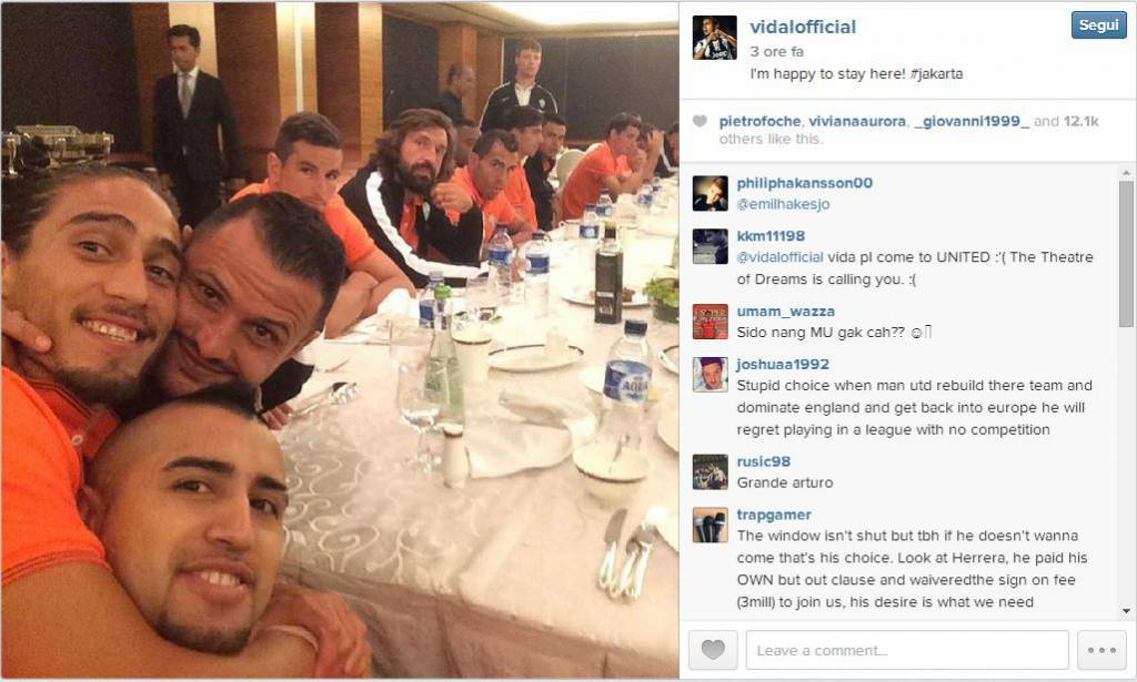 CALCIOMERCATO JUVENTUS VIDAL INSTAGRAM – Nel mercato del 2014, oggi più che mai, le dichiarazioni dei calciatori fatte attraverso i social network, si trasformano in vere e proprie notizie. Basta un’immagine, uno scatto, o una frase ben precisa, per scatenare il mercato. Arturo Vidal questo lo sa bene e con una foto su Instagram ha stamani lasciato trapelare qualcosa, riguardante il suo possibile futuro. Rispondendo alle voci che lo volevano già pronto a fare battaglia con la dirigenza bianconera per trasferirsi a Manchester, Vidal pubblica una foto con i compagni a tavola in quel di Jakarta scrivendo: “Sono felice di stare qui #Jakarta”. Un messaggio che può dire molto come nulla, ma che intanto fa disperare i tifosi del ManchesterUnited e fa sognare quelli della Juventus.