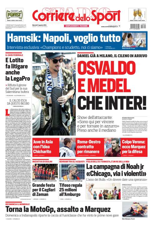 CORRIERE INTER – Inter scatenata sul mercato, ieri è arrivato Osvaldo, oggi o domani toccherà a Medel.