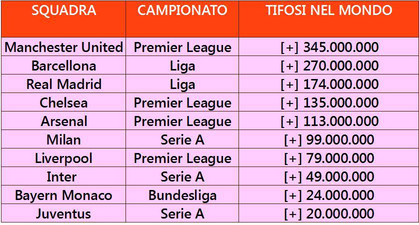 FOTO TOP 10 CLUB PIU’ TIFOSI 3 ITALIANE – La passione per il calcio in tutto il mondo è a dir poco totalizzante. In estate soprattutto, grazie alle tournèe promozionali organizzate dai club in ogni parte del globo, è facile notare come anche nelle zone più remote, la voglia di calcio sia veramente tantissima. Il noto portale PurelyFootball.com, ha realizzato una Top 10 delle squadre che hanno maggiormente seguito nel mondo. Tra le squadre con più tifosi, risultano esserci tre italiane: Milan, Inter e Juventus. Domina, ma non avevamo dubbi in merito, il Manchester United con più di 345 milioni di tifosi.