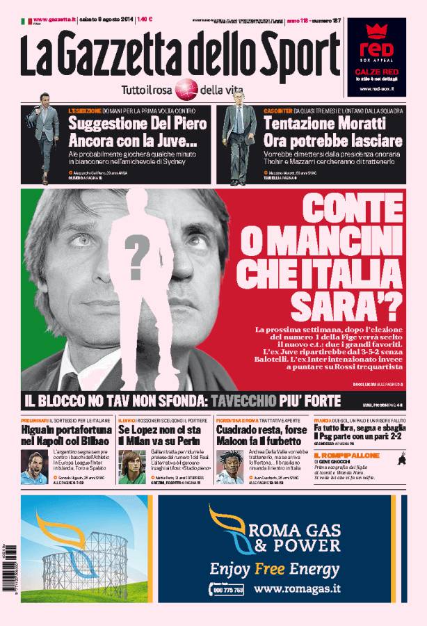 GAZZETTA CONTE MANCINI – La prossima settimana verrà svelato il nome del nuovo c.t. italiano, Conte o Mancini per la panchina.