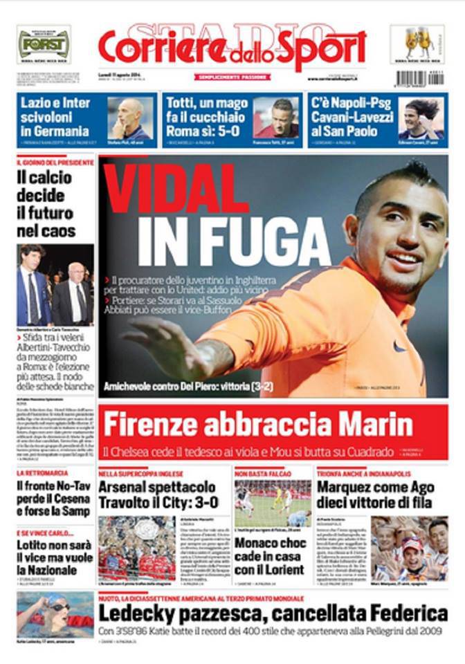 RASSEGNA STAMPA CORRIERE DELLO SPORT – Il procuratore di Arturo Vidal è in Inghilterra per trattare con il Manchester United: addio più vicino. Portieri: se Storari va al Sassuolo, Abbiati può essere il vice Buffon. Lazio e Inter, scivoloni in Germania. Totti, un mago fa il cucchiaio. Roma 5-0. C’è Napoli-Psg: Cavani e Lavezzi al San Paolo.