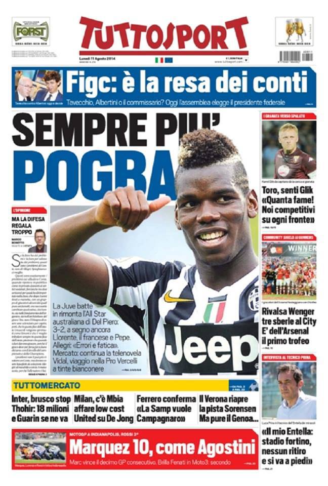 RASSEGNA STAMPA TUTTOSPORT – La Juventus batte in rimonta l’All Star australiana di Del Piero: 3-2, a segno ancora Llorente, il francese e Pepe. Allegri: “errori e fatica”. Mercato: continua la telenovela Vidal, viaggio nella Pro Vercelli a tinte bianconere. Figc: è la resa dei conti. Inter, brutto stop. Thohir: 18 milioni e Guarin se ne va. Milan, c’è Mbia, affare low cost. United su De Jong.