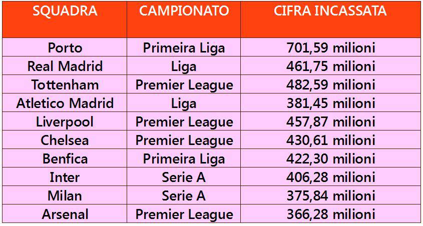 Nel mercato non vince soltanto chi spende tanto ma anche, e soprattutto, chi sa incassare bene. Lo abbiamo imparato nelle scorse stagioni: avere un budget illimitato porta senza dubbio a ottimi risultati, ma se si riesce a gestire bene le risorse riuscendo a far cassa nel momento giusto, si arriva comunque a costruire una grande squadra. Sfruttando i dati forniti dal noto portale Transfermarkt.it, abbiamo messo in piedi la Top 10 dei club europei che hanno maggiormente incassato sul mercato, partendo dalla stagione 2004-2005 sino ad arrivare a quella corrente. Grande stupore, ovviamente, adocchiando le cifre riguardanti il Porto: la squadra lusitana, assoluta dominatrice di questa classifica, ha incassato sin qui, la bellezza di 701 milioni di euro in 10 anni. In graduatoria anche due italiane: Inter e Milan si trovano rispettivamente all’8° ed al 9° posto. Terza delle italiane la Juventus all’11° posto.