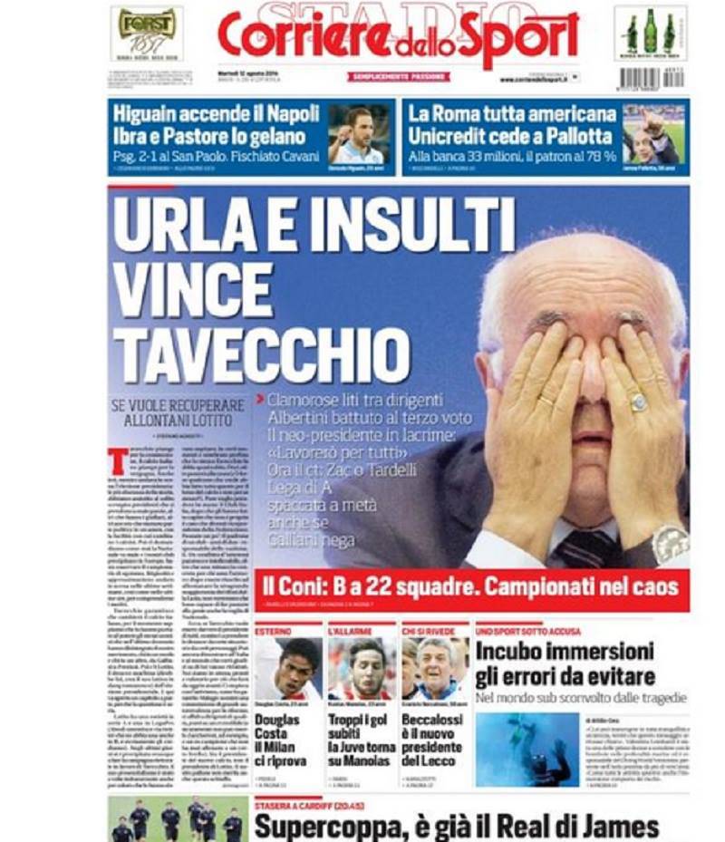 RASSEGNA STAMPA CORRIERE DELLO SPORT – Clamorose liti tra i dirigenti. Albertini battuto alla terza votazione. Il neo presidente Tavecchio in lacrime: “Lavorerò per tutti”. Ora il C.T., Zaccheroni o Tardelli. Douglas Costa, il Milan ci riprova. Troppi gol subiti, la Juve torna su Manolas. Higuain accende il Napoli, Ibra e Pastore lo gelano. La Roma tutta americana: Unicredit cede a Pallotta.